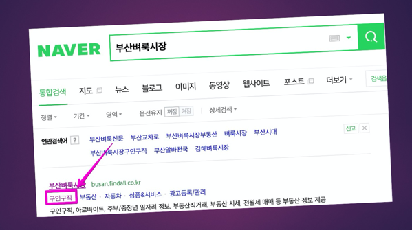부산 일자리 사이트를 방문하려면 네이버에서 '부산 벼룩시장'을 검색하는 것이 선행되어야 합니다. 위 이미지는 네이버에서 검색한 결과입니다. 여기에서 구인구직을 클릭하면 바로 사이트로 이동할 수 있습니다.