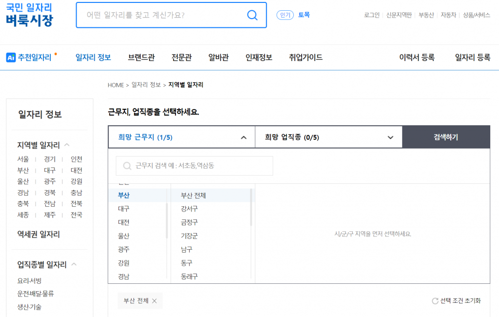 해당 사이트로 들어가면 위와 같은 화면을 볼 수 있습니다. 원하는 지역과 업직종을 선택하면 자신이 원하는 일자리 공고 확인할 수 있습니다.